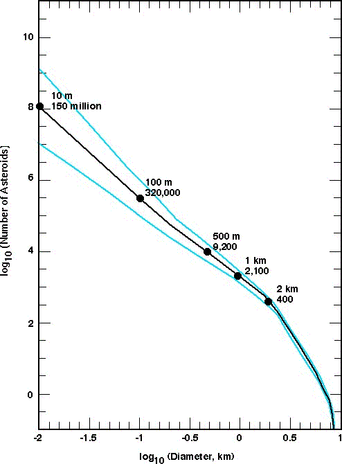 where k is a constant and b is the power-law exponent. Although the general form of this size distribution is demonstrated by observations, The detailed distribution is not well known. The simulations that will be described in subsequent chapters require a model for the asteroid population, however. For our ECA population model, we estimate that changes in the power law occur at diameters of 0.25 and 2.5 km, and have adopted exponents 0f -2.6 (D<= 0.25 km), -2.0 (0.25 KM < D <= 2.5 KM), AND -4.3 (D > 2.5 KM).