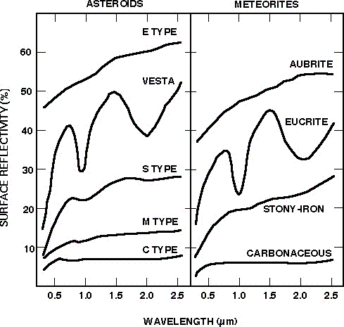 Although most known Earth-approaching asteroids have never been observed for physical properties, and those that have been are generally only poorly observed relative to the brighter main belt asteroids, some things can be said about them. They exhibit a diversity in inferred mineralogy approaching that in the rest of the asteroid population. The majority are expected to be similar to the dark C-type asteroids in general properties (presumably moderately low-density, volatile-rich bodies, colored black due to at least several percent of opaques). There are also a large number of S types. (S's are thought to be either stony, chondrite-like objects, stony-iron objects, or a combination of both.) In addition, there are known examples of metallic bodies (probably like nickel-iron alloy meteorites) and rocky, monomineralic bodies.