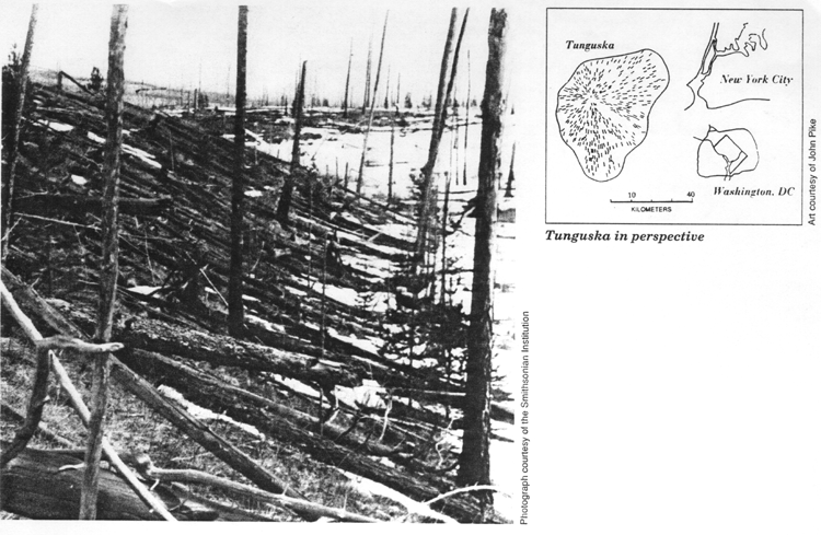 FIGURE 2.2. On June 30, 1908, at 7:40 AM, a cosmic projectile exploded in the sky over Siberia. It flattened 2,000 square kilometers of forest in the Tunguska region. If a similar event were to occur today, hundreds of thousands of people would be killed, and damage would be measured in hundreds of billions of dollars.