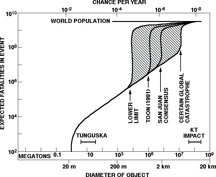 Every few centuries the Earth is struck by an NEO large enough to cause thousands of deaths, or hundreds of thousands of deaths if it were to strike in an urban area. On time scales of millennia, impacts large enough to cause damage comparable to the greatest known natural disasters may be expected to occur (Pike 1991). Indeed, during our lifetime, there is a small but non-zero chance (very roughly 1 in 10,000) that the Earth will be struck by an object large enough to destroy food crops on a global scale and possibly end civilization as we know it (Shoemaker and others 1990).
